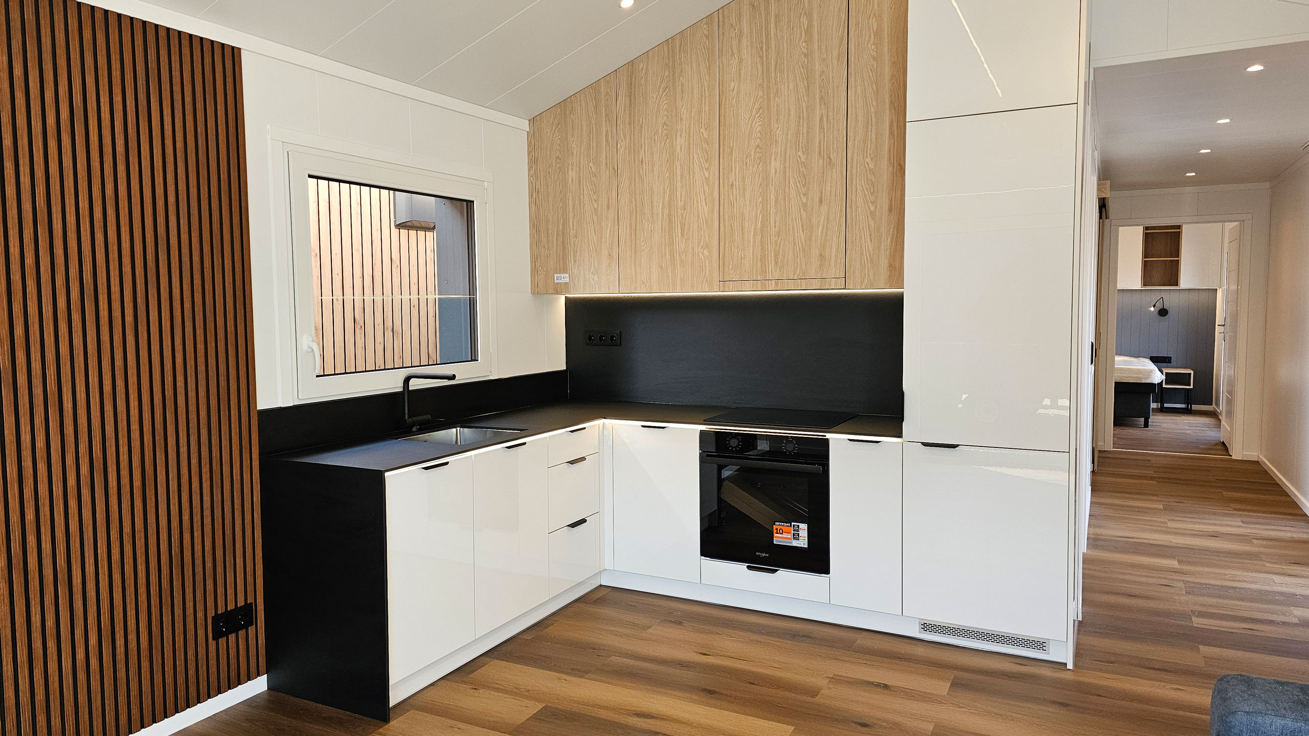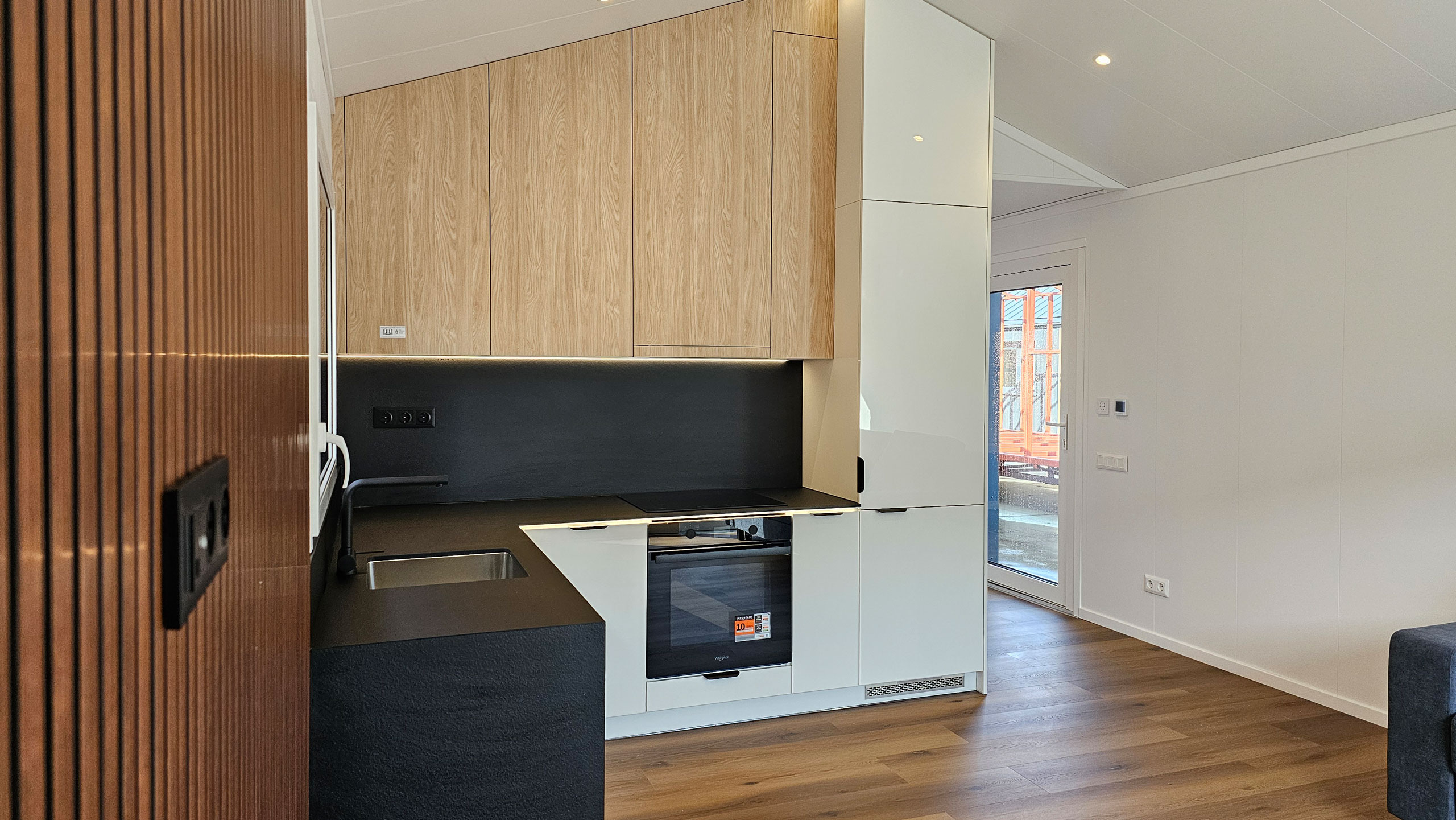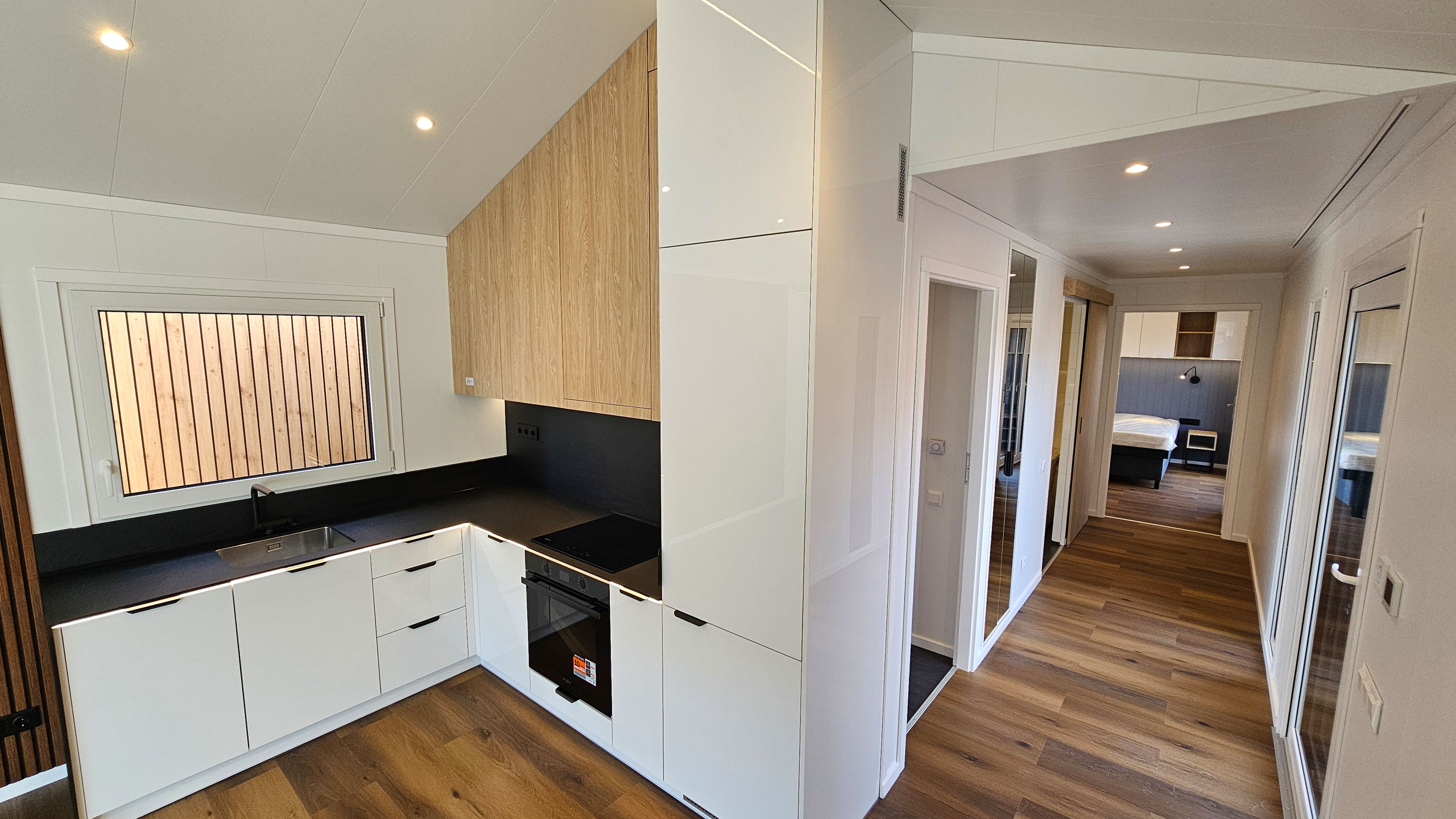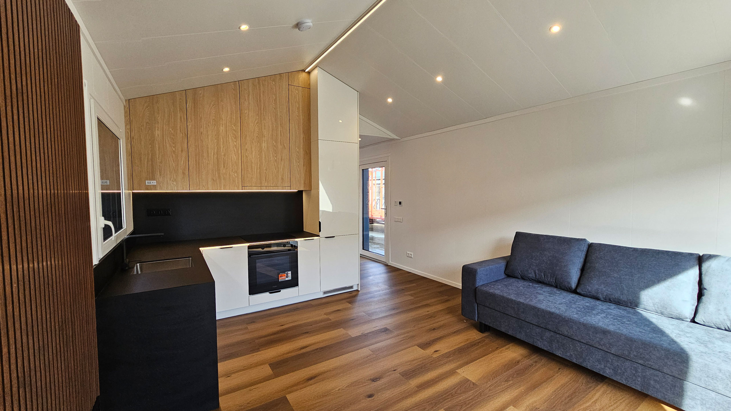 Das Herzstück des Ascona ist der lichtdurchflutete Wohnbereich. Die deckenhohe Einbauküche ist ergonomisch perfekt geplant und mit energieeffizienten Markengeräten (Induktion, Backofen mit Mikrowellenfunktion, Geschirrspüler) ausgestattet. Hier ist alles so angeordnet, dass die täglichen Abläufe mühelos von der Hand gehen.