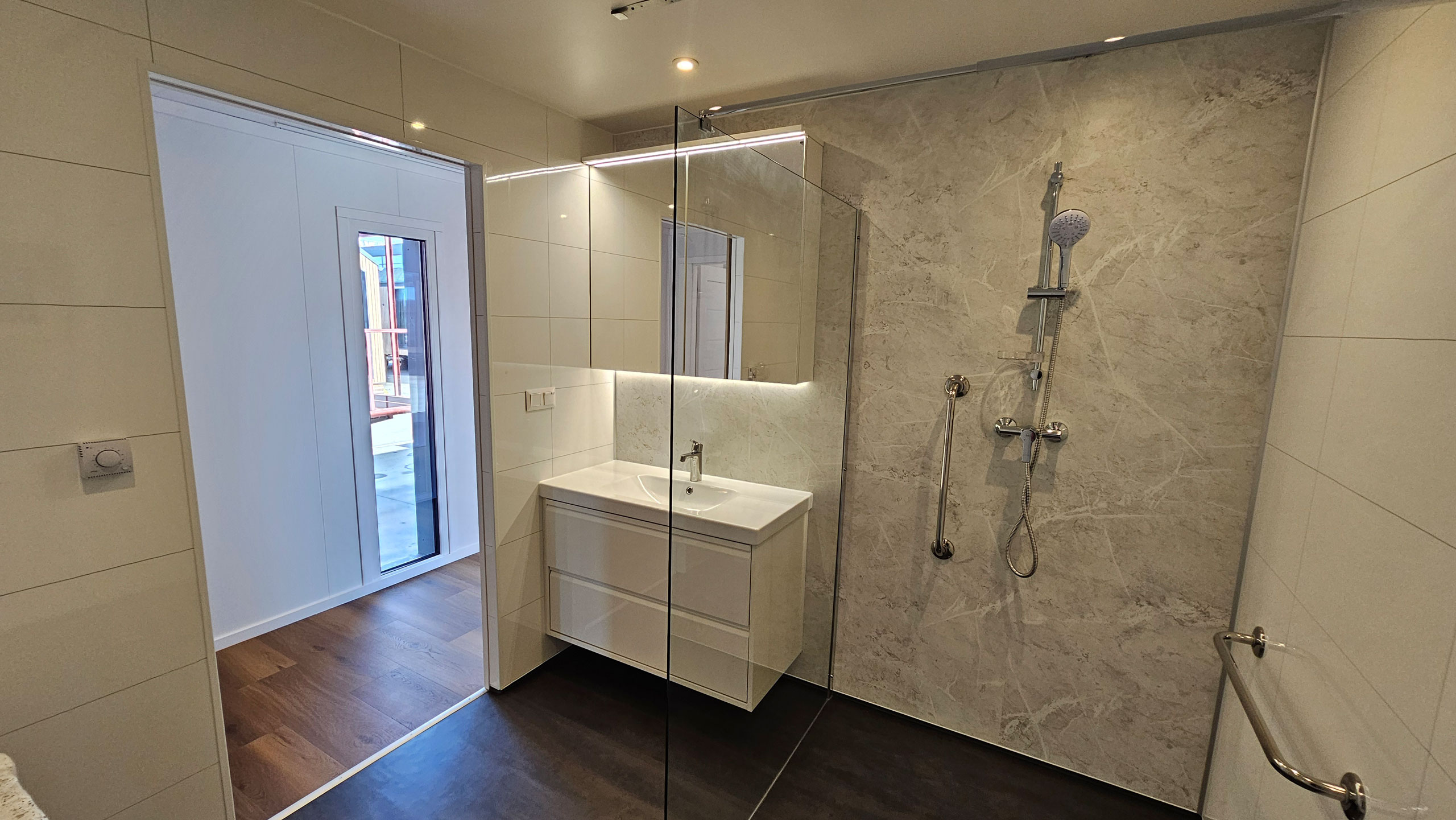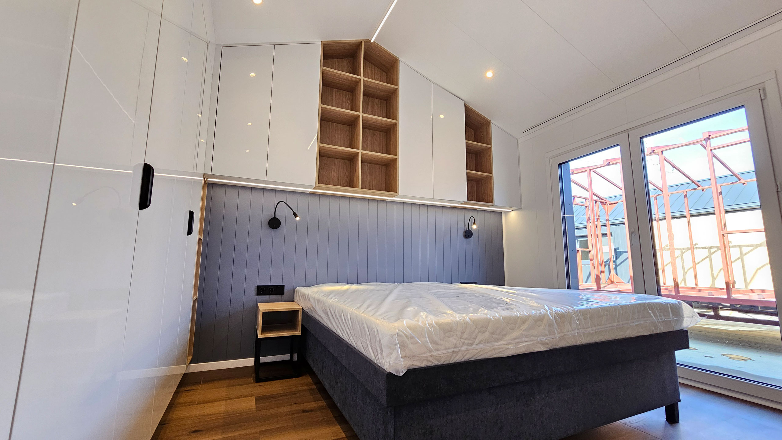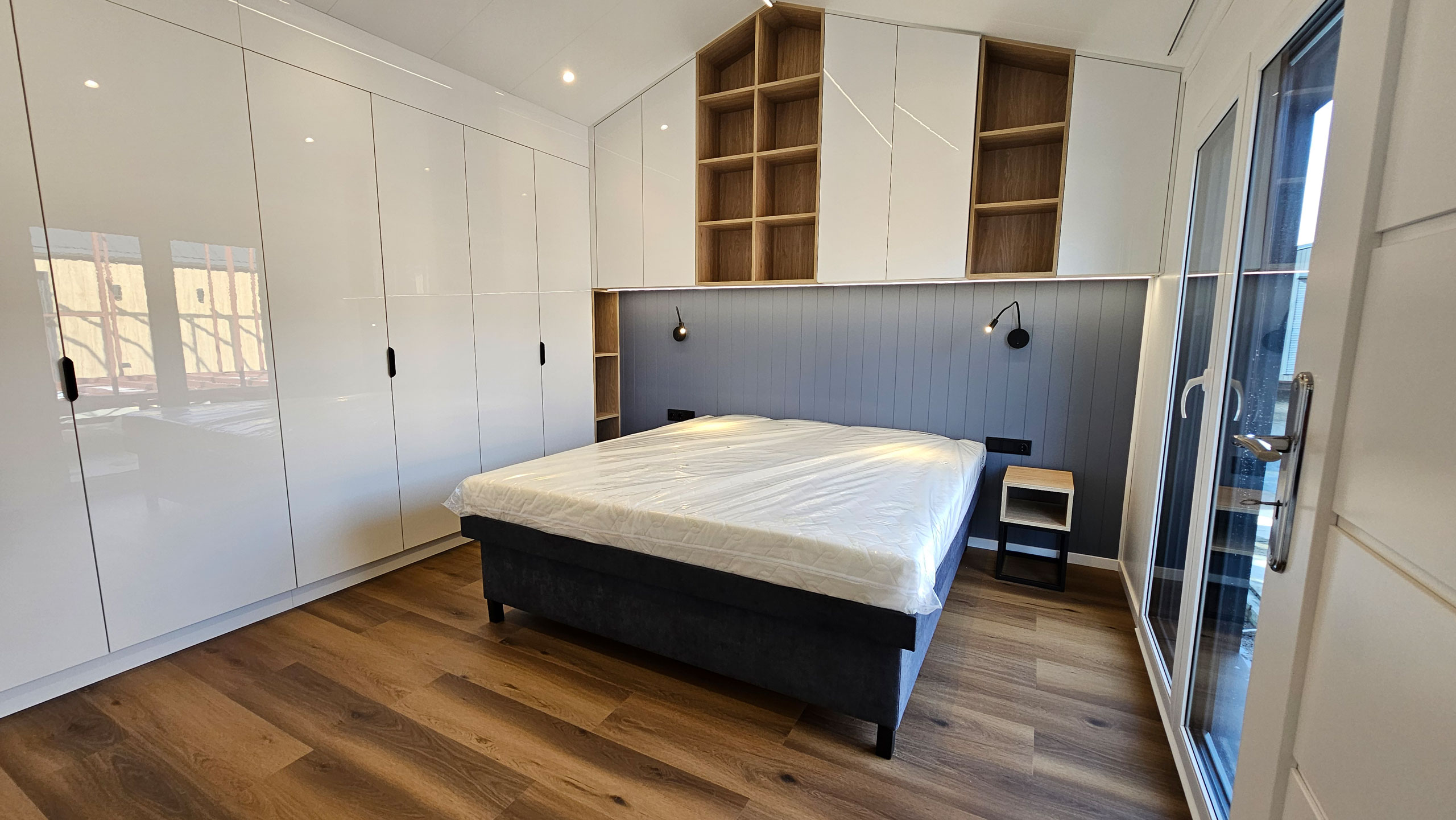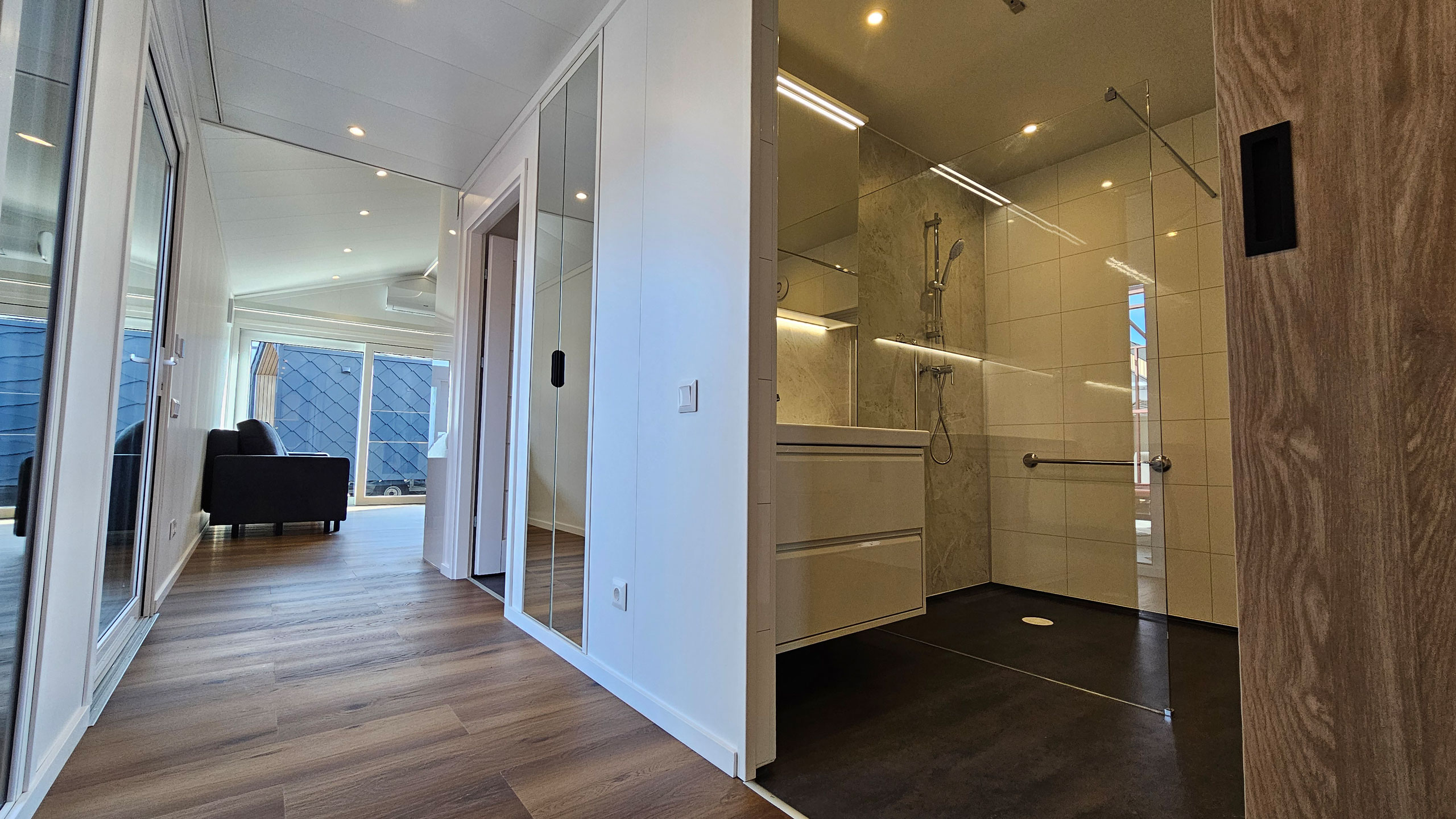 Das Schlafzimmer bietet mit einem 180×200 cm großen Bett und einem deckenhohen Schiebetürenschrank enormen Stauraum, ohne den Raum einzuengen. Das Badezimmer ist als großzügiges Komfort-Bad gestaltet: Eine bodengleiche 120×120 cm Walk-in-Dusche und eine Infrarot-Deckenheizung garantieren Sicherheit und ein angenehmes Wohlbefinden zu jeder Zeit.