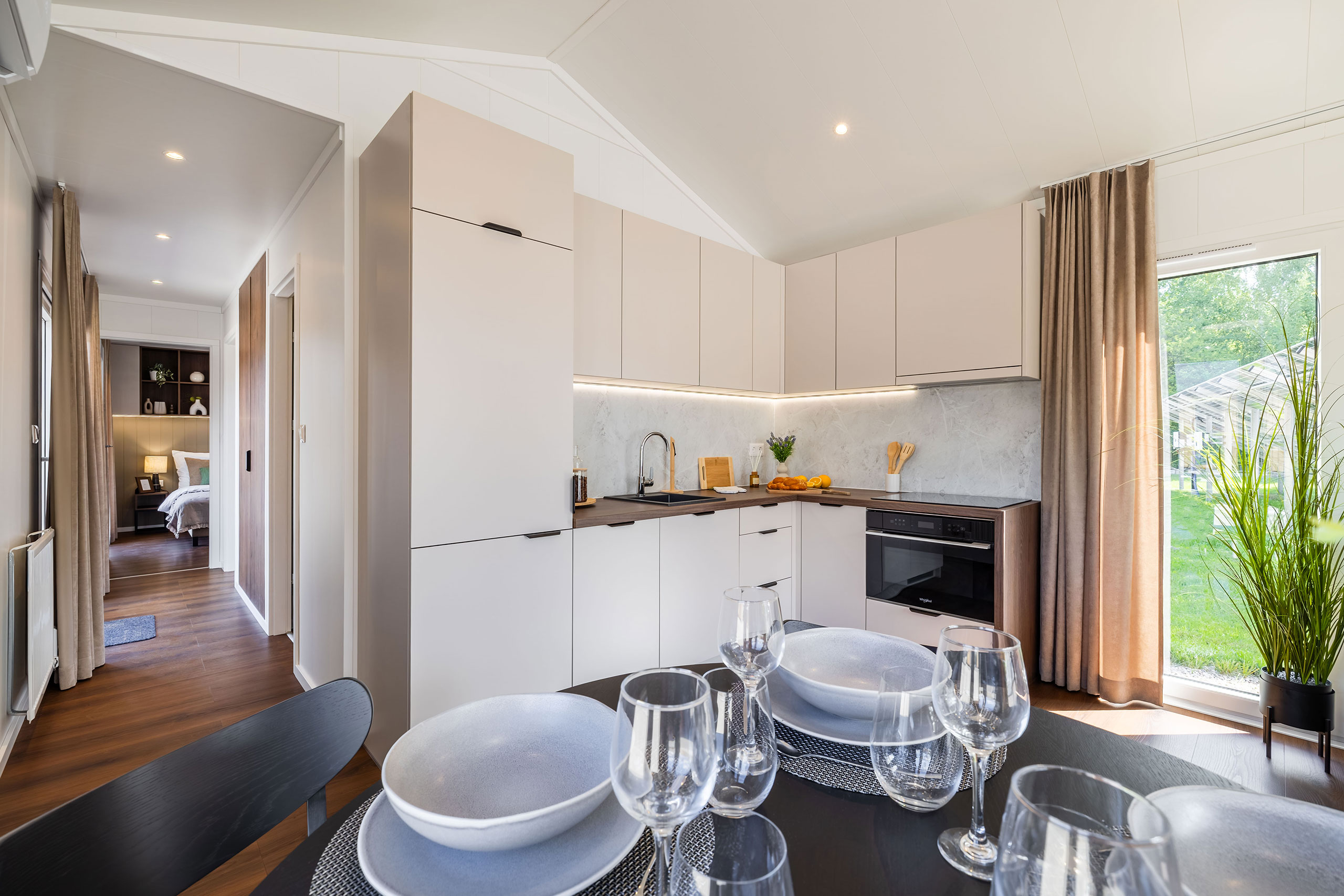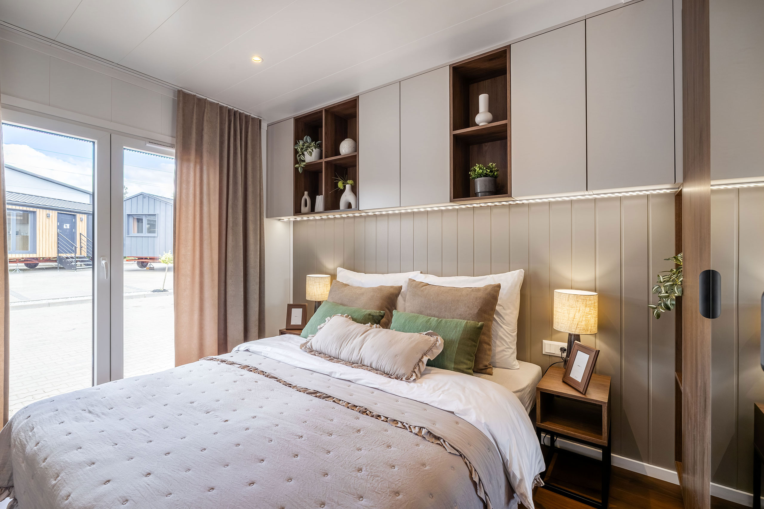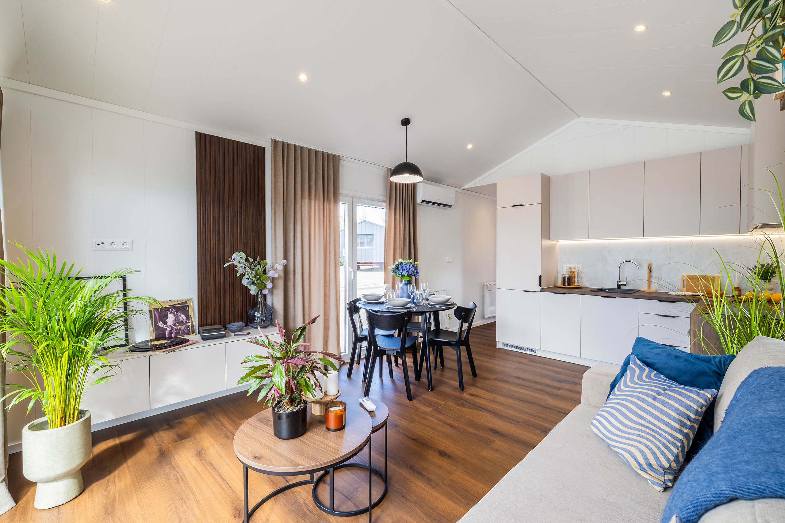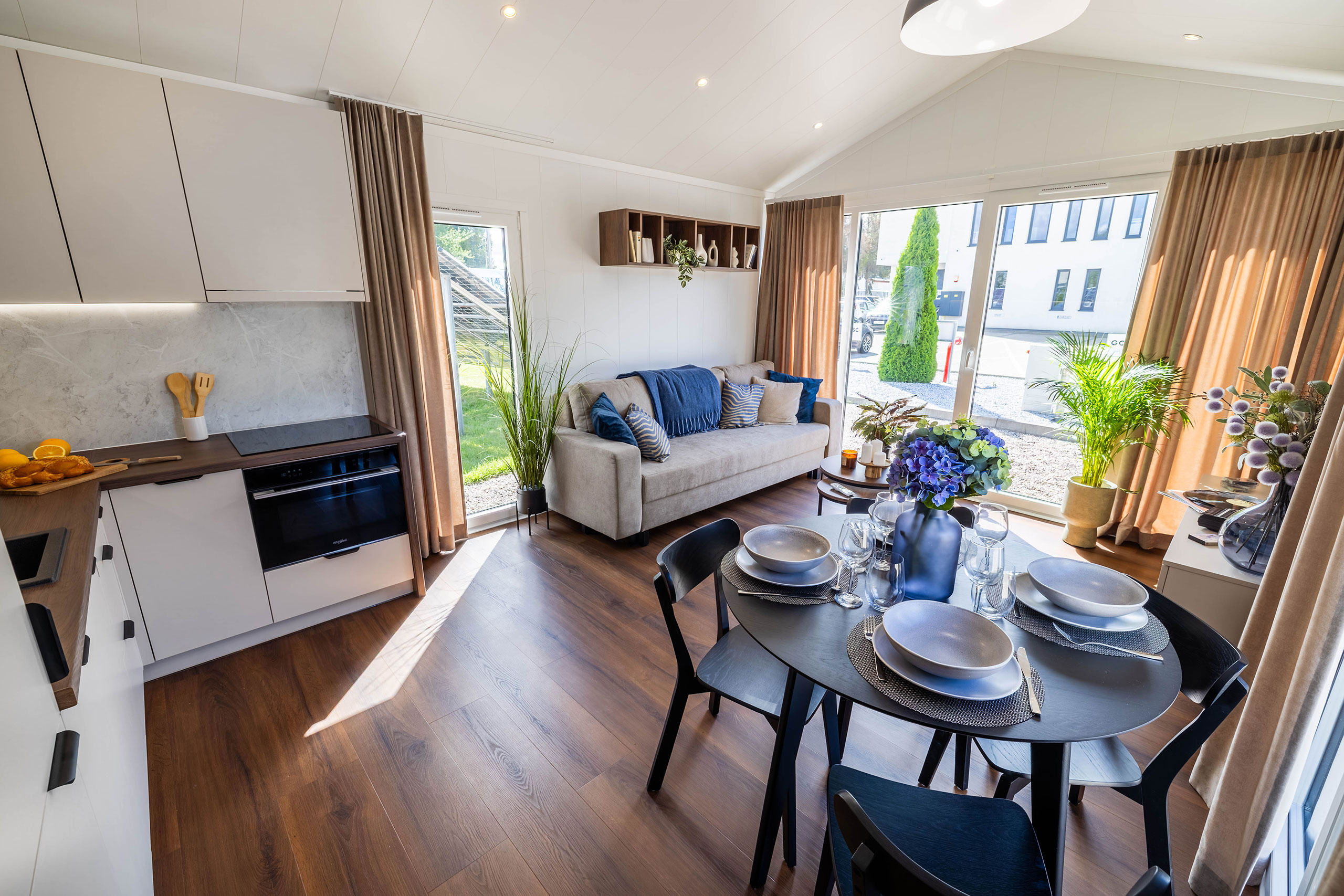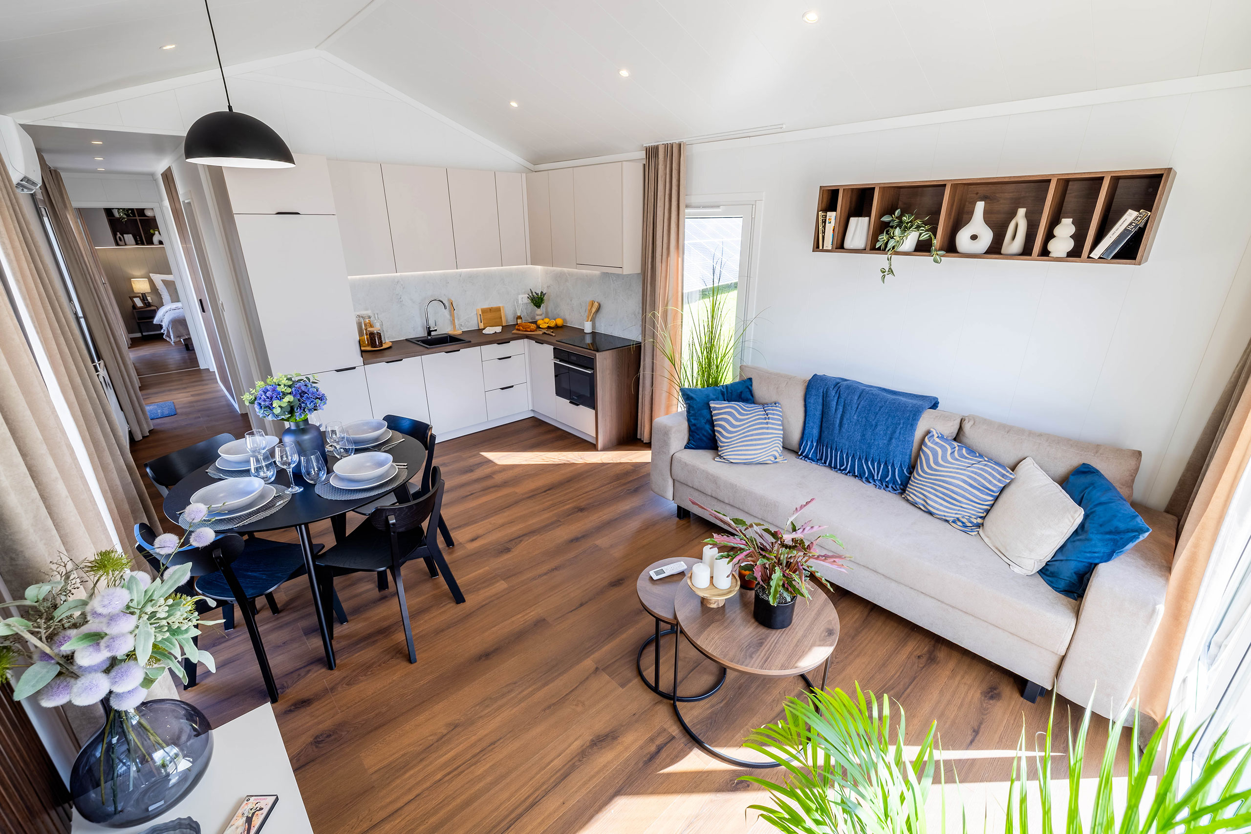 Das Modell Elba FF setzt neue Maßstäbe in Sachen Raumhöhe und Design. Durch die spezielle Flat-Floor-Bauweise ohne sichtbare Räder und die markante Dachneigung von 30° entsteht ein Innenraumvolumen, das klassischen Ferienhäusern in nichts nachsteht. Auf 55 m² bietet Elba eine luxuriöse Ausstattung, die perfekt für die ganzjährige Nutzung optimiert ist.