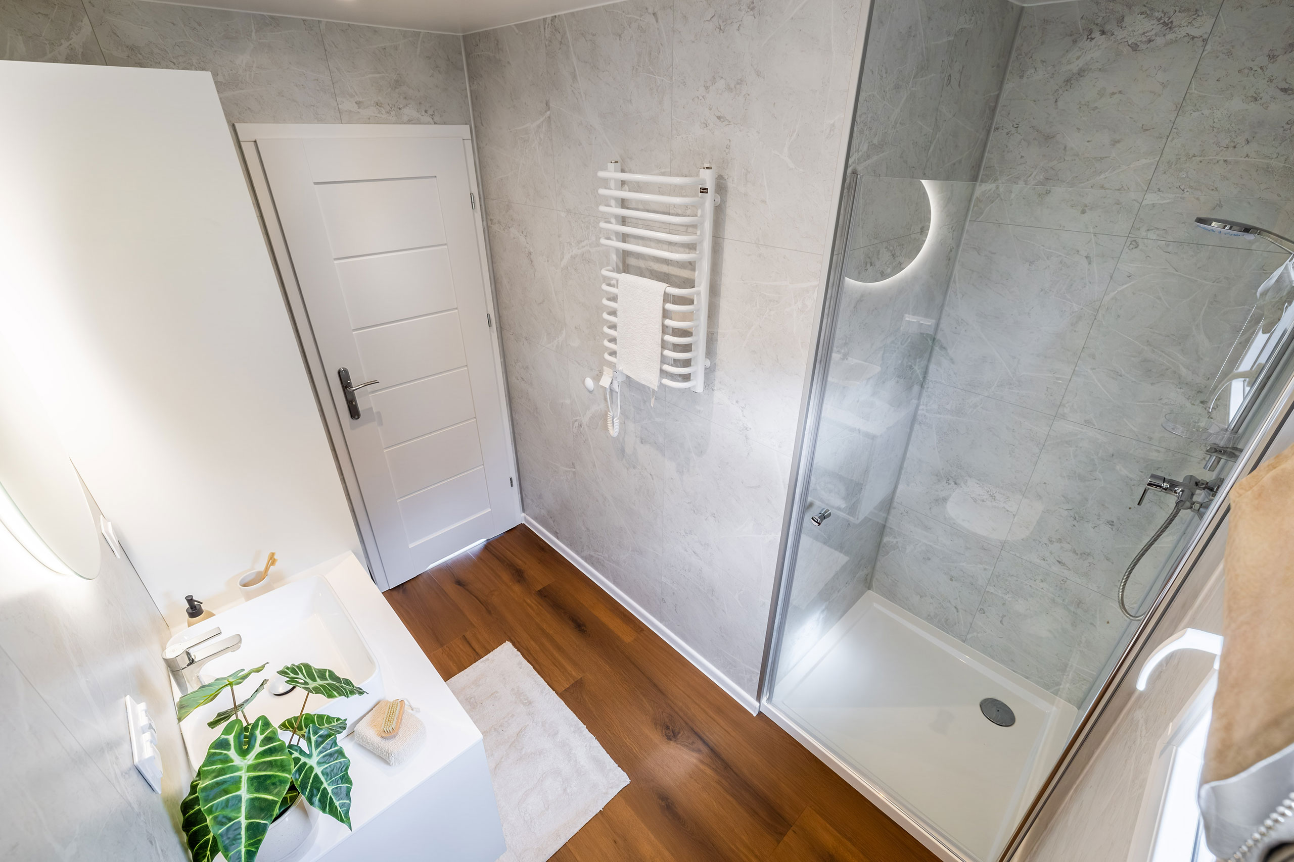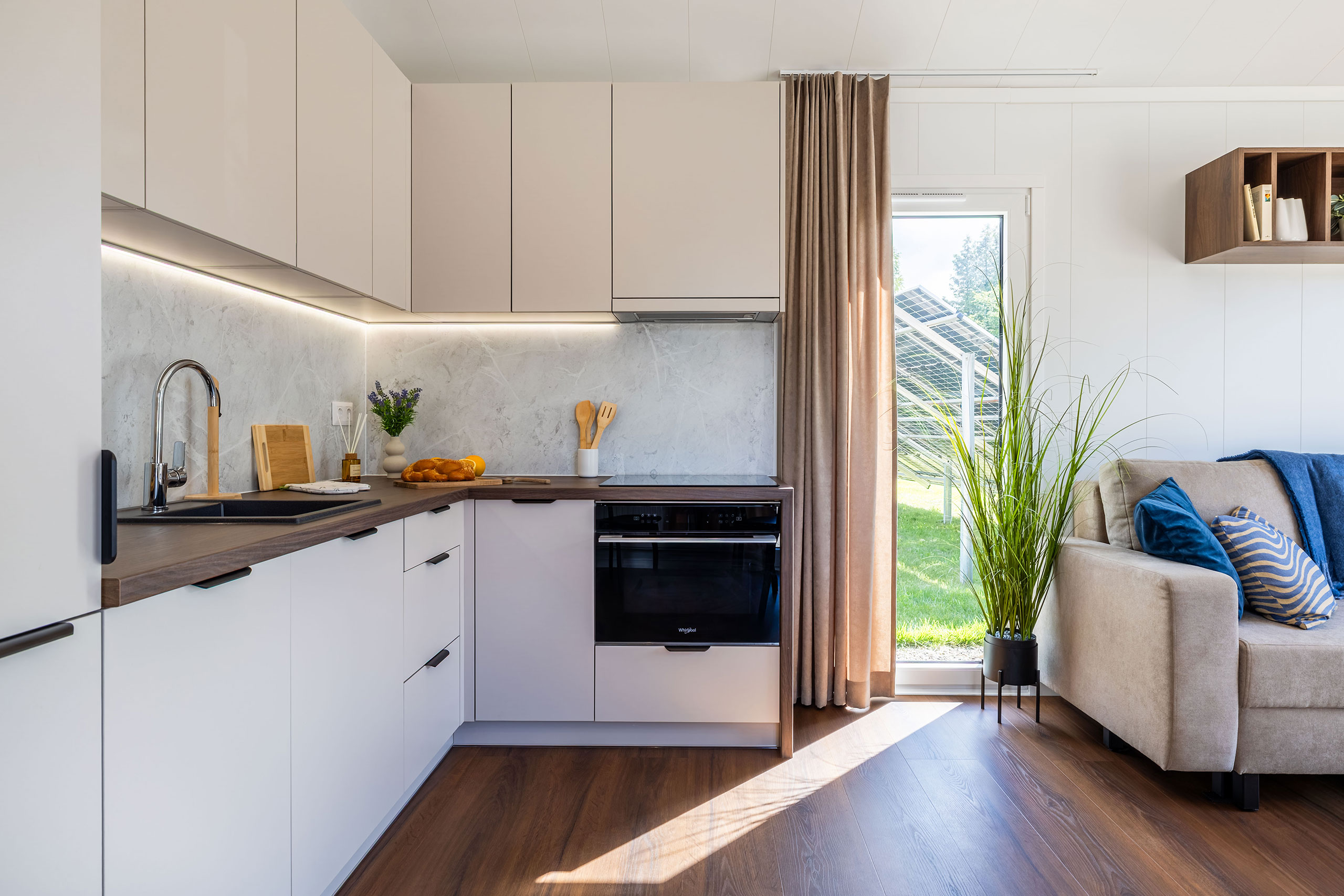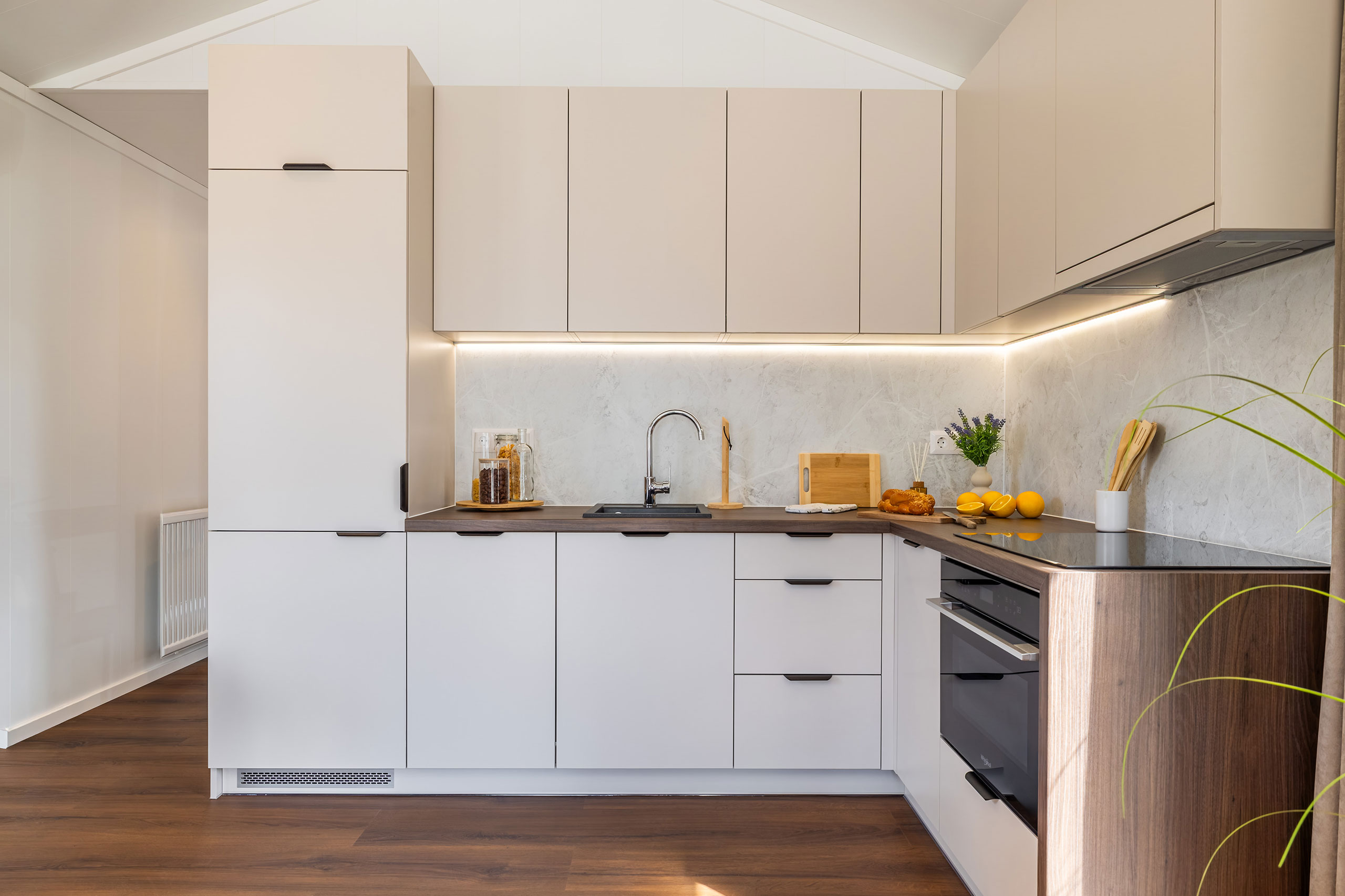 • Hochwertige Oberflächen: Veredelte Fronten in Küche und Bad, die nicht nur optisch überzeugen, sondern auch besonders pflegeleicht und langlebig sind.