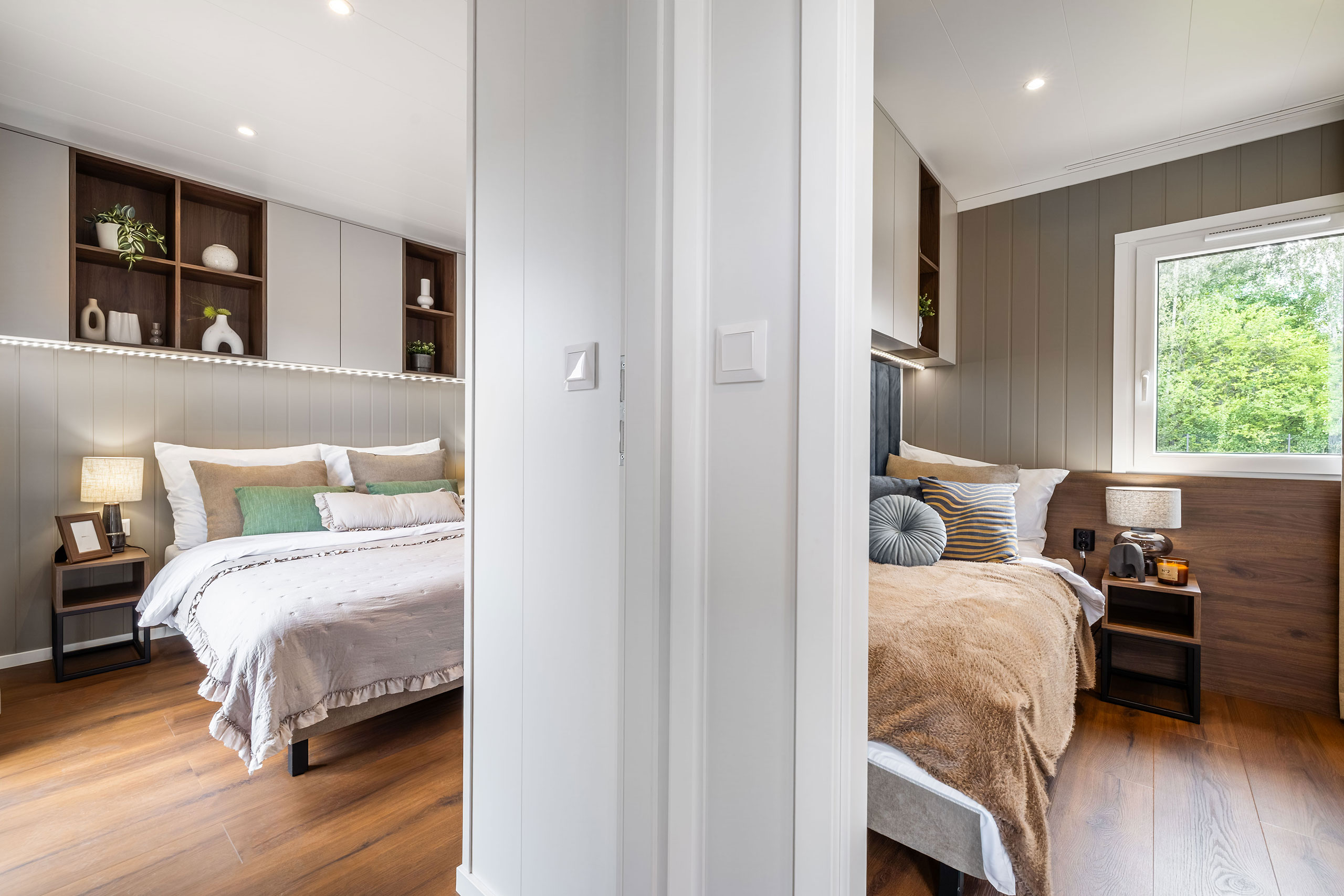 Der Grundriss des Elba wurde konsequent auf Ergonomie und Stauraum optimiert. Ein besonderes Merkmal ist der großzügige Flur, der eine praktische Nische für einen großen Garderobenschrank bietet – ein Detail, das den Alltag spürbar erleichtert. Die beiden Schlafzimmer liegen nebeneinander, was den Wohnbereich räumlich klar abtrennt und so für eine ruhige Atmosphäre in den Schlafräumen sorgt.