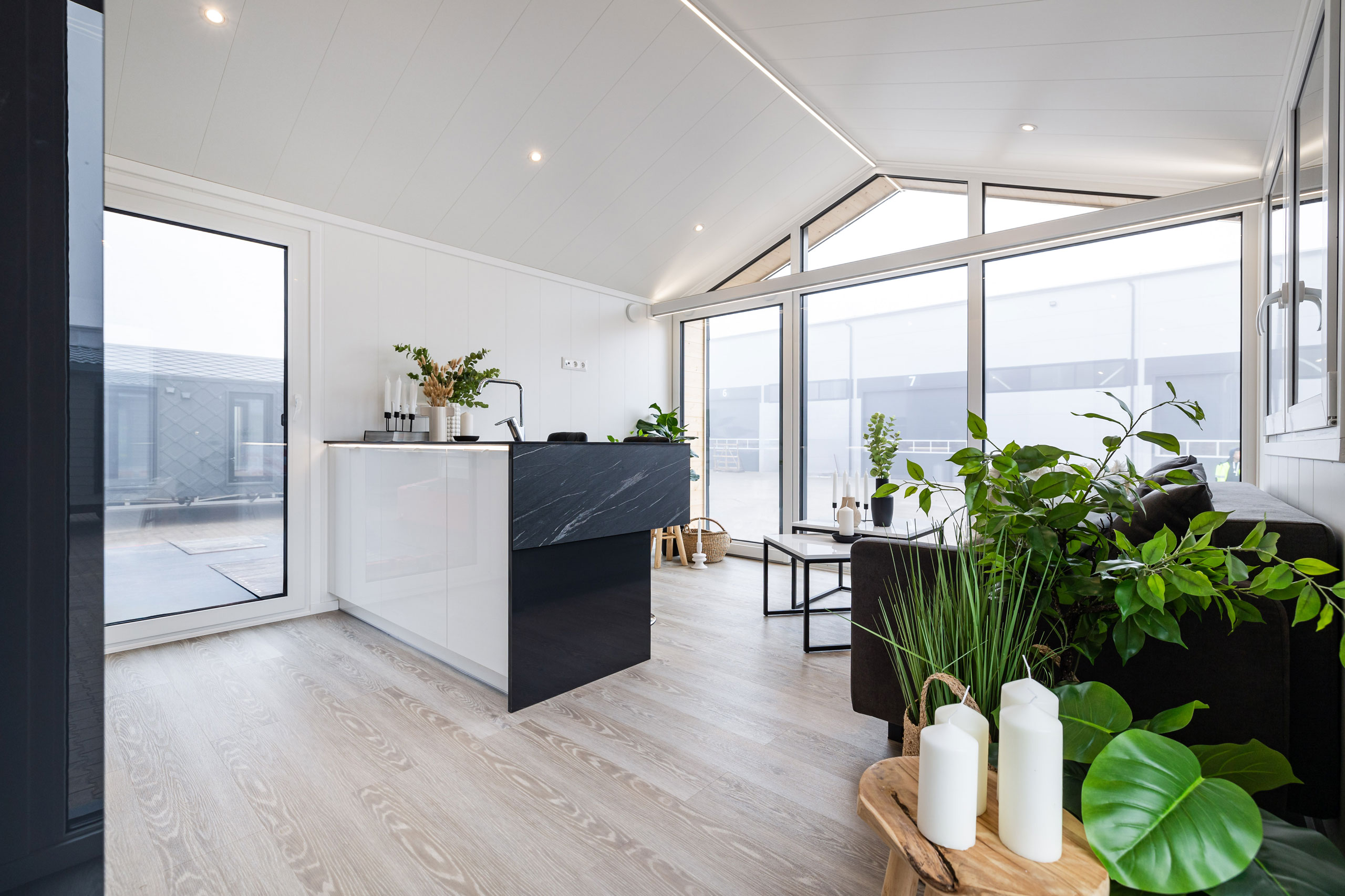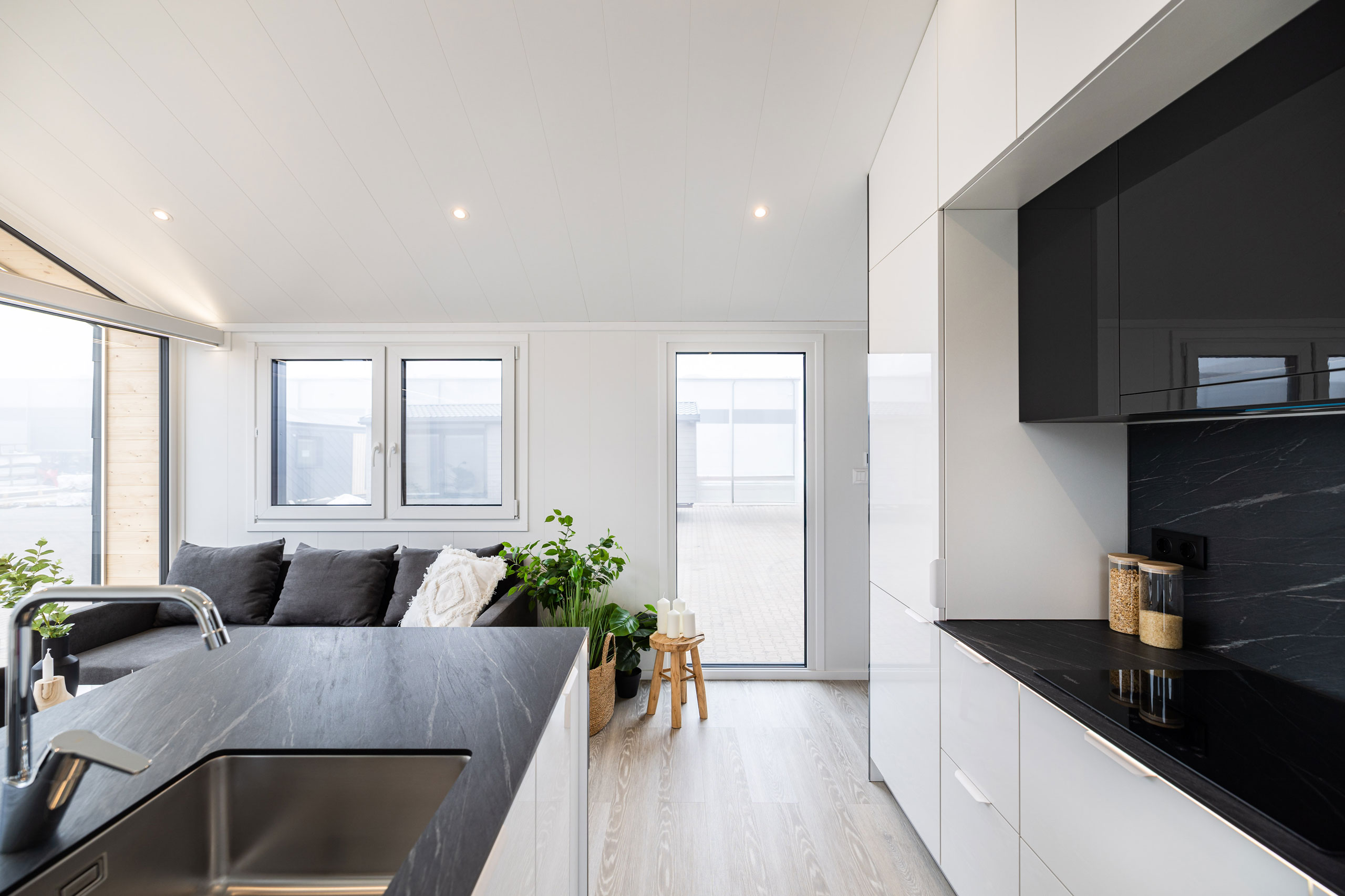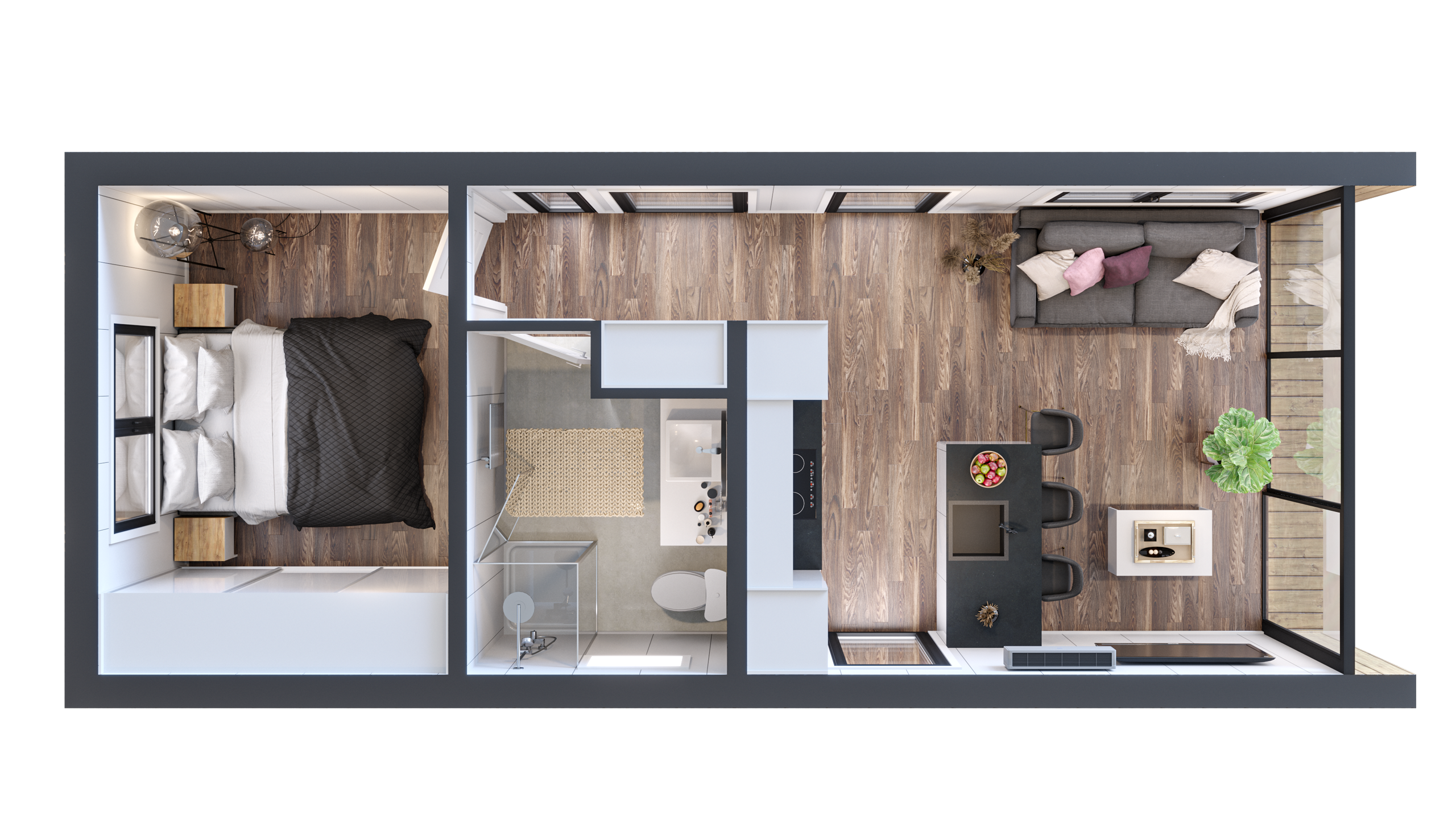 Trotz der kompakten Außenmaße bietet das Sky Light einen Grundriss, bei dem jeder Zentimeter sinnvoll genutzt wird. Das Herzstück ist der offene Wohnbereich mit integrierter Küchenzeile, der durch die bodentiefen Verglasungen eine direkte Verbindung zur Natur schafft. Ein separates, gemütliches Schlafzimmer und ein modern gestaltetes Badezimmer runden das Raumangebot ab.