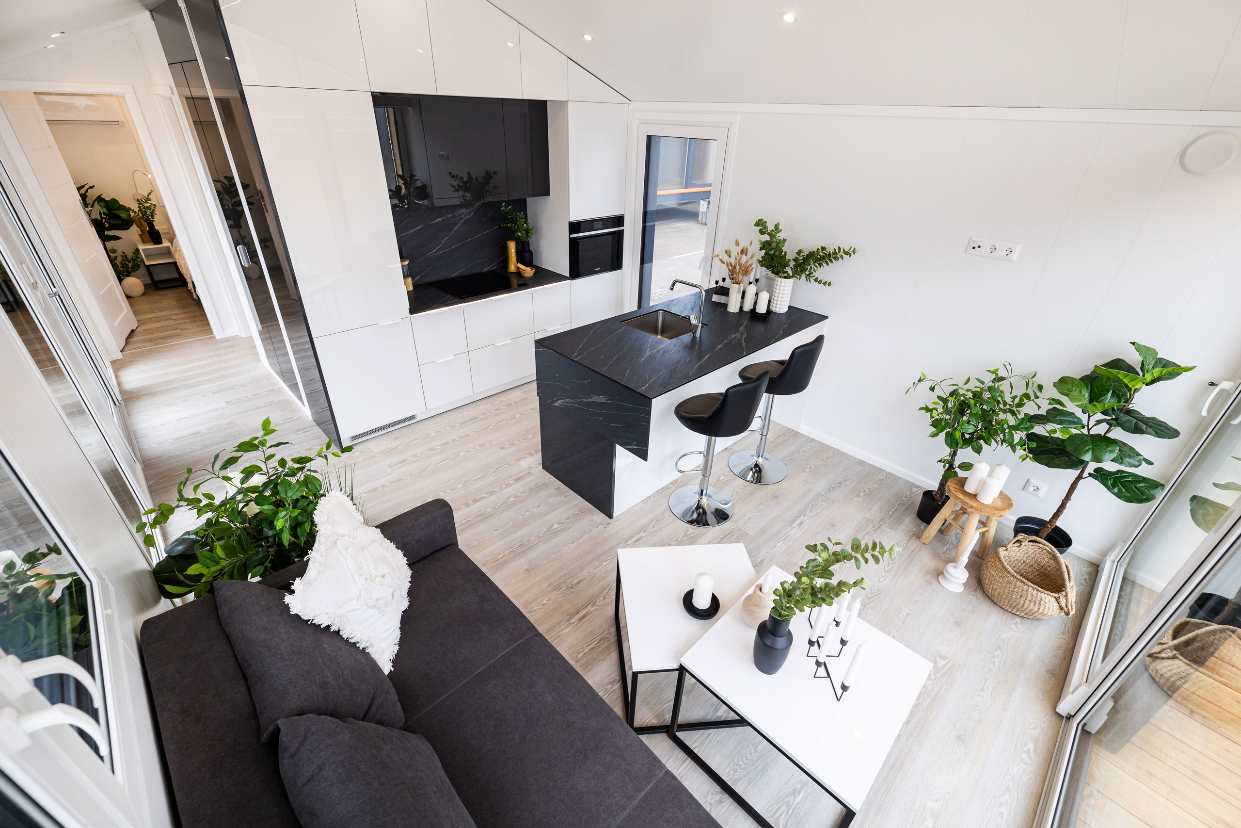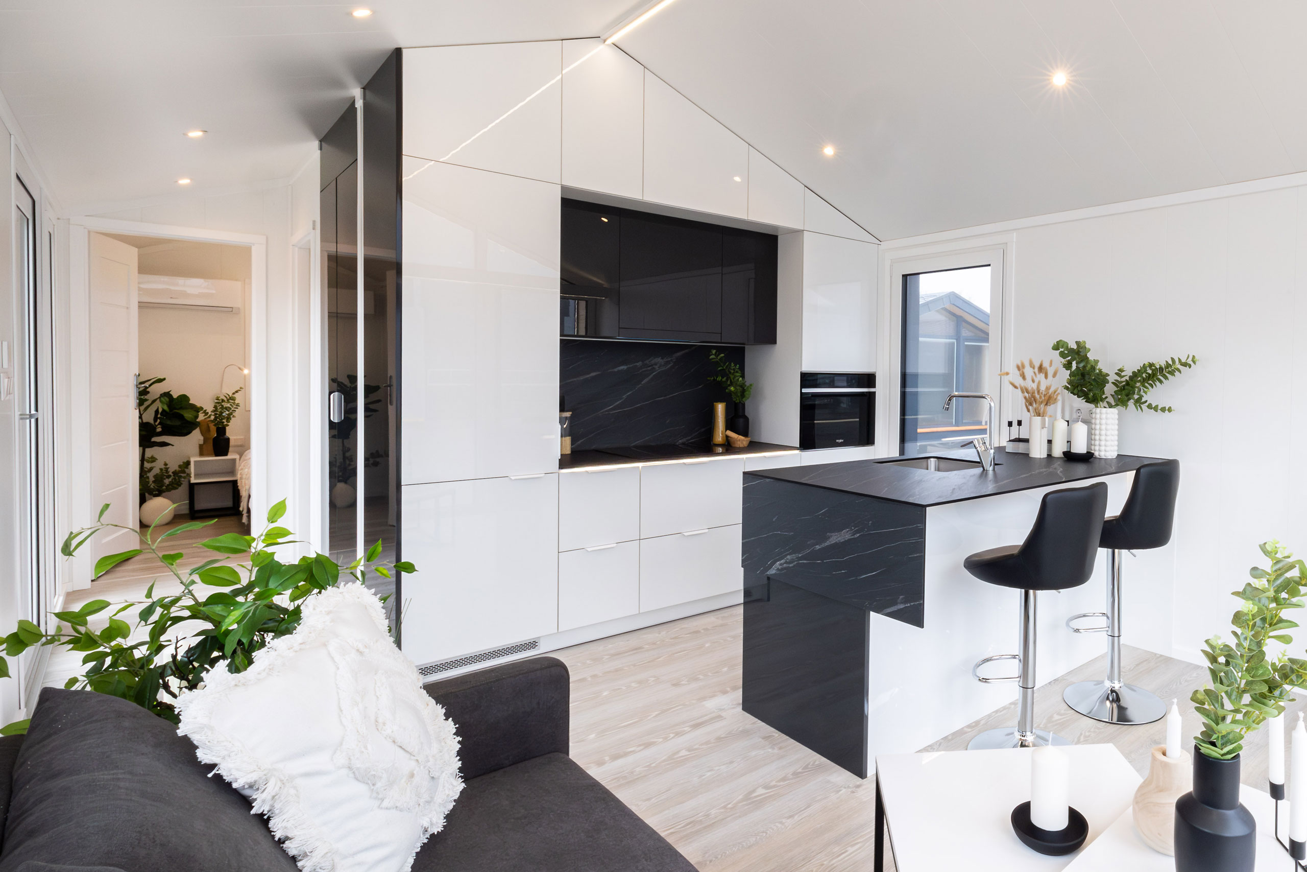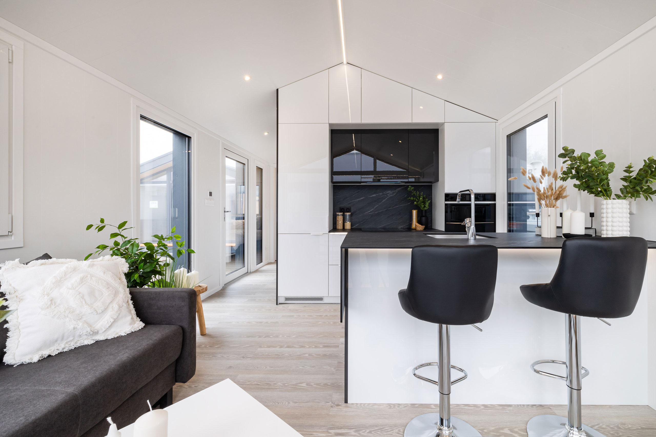 Trotz der kompakten Außenmaße bietet das Sky Light einen Grundriss, bei dem jeder Zentimeter sinnvoll genutzt wird. Das Herzstück ist der offene Wohnbereich mit integrierter Küchenzeile, der durch die bodentiefen Verglasungen eine direkte Verbindung zur Natur schafft. Ein separates, gemütliches Schlafzimmer und ein modern gestaltetes Badezimmer runden das Raumangebot ab.